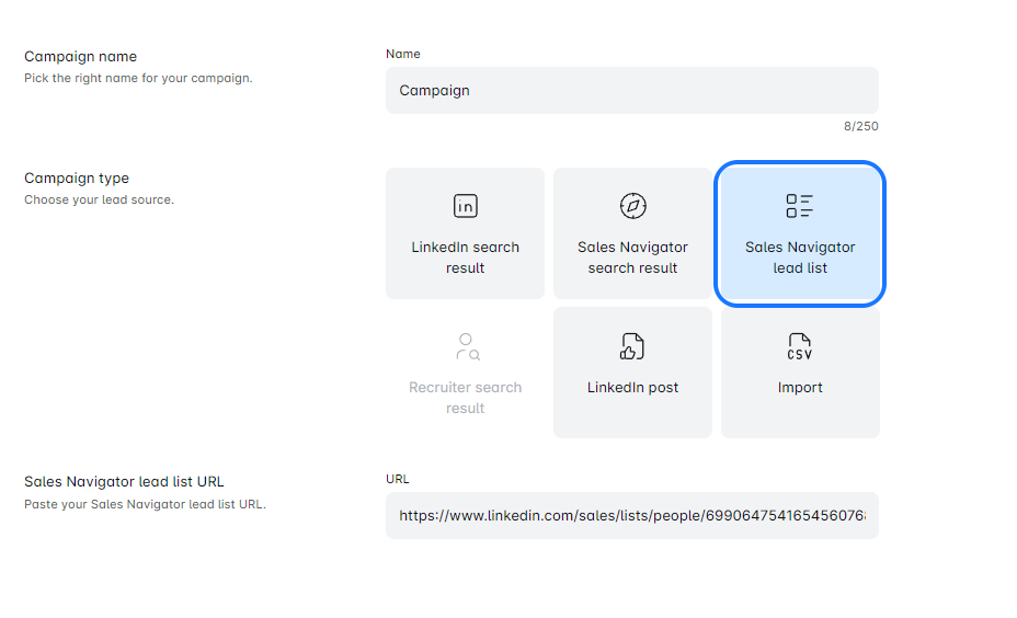 - Once you’ve filled your list with leads, it’s time to set up your campaign! Copy the URL of your Leads List, paste it into the designated area in the LinxLead, and give your campaign an awesome name.